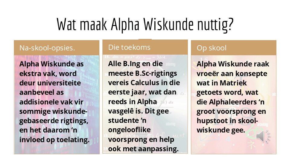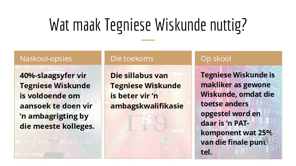 Kyk die drie beelde hieronder vir ’n vinnige oorsig van hoe ons wiskunde en tegniese wiskunde aanbied.