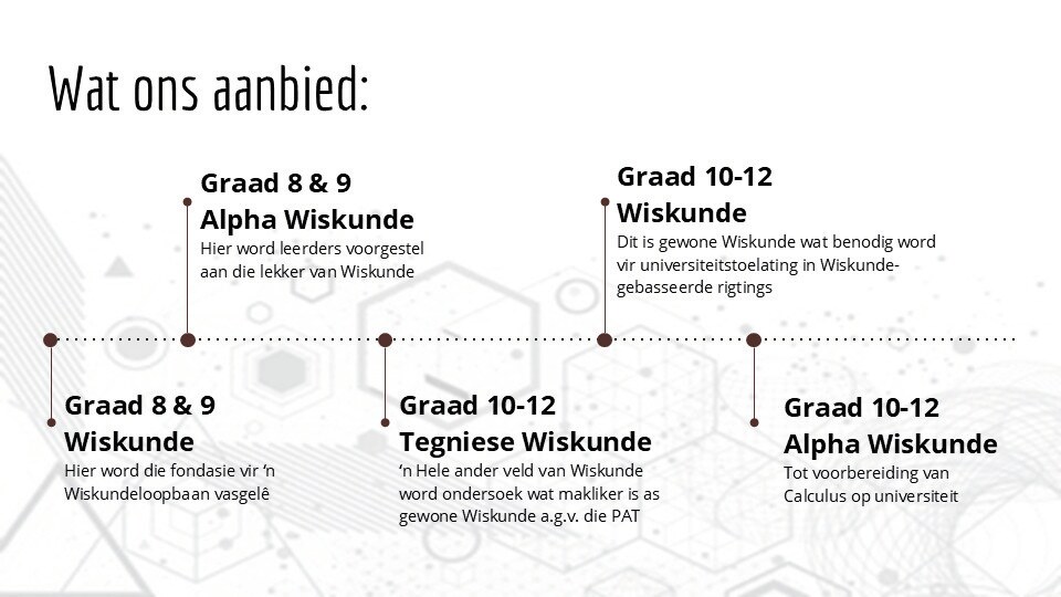 Kyk die drie beelde hieronder vir ’n vinnige oorsig van hoe ons wiskunde en tegniese wiskunde aanbied.